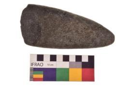 | Description / विवरण | Specimen of an handaxe with one elonagted side for holding purpose . It is dark brown in colour and smooth in texture. |