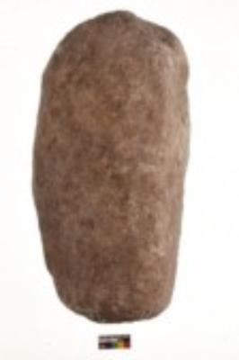 | Description / विवरण | Specimen of an oval shaped saddle quern with coarse uneven texture of surface. It is brownish in colour and has flat base. |