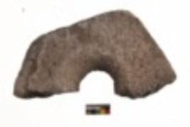| Description / विवरण | Specimen of a roughly oval shaped grinding stone with perforation. It is dark brown in colour and coarse in texture. It has flat base. |