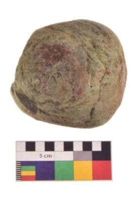 | Description / विवरण | Specimen of a roughly round shaped hammerstone with smooth texture. It is brownish in colour and round in cross section. |