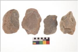 | Description / विवरण | Specimen of a Irregular flaked pebble with projected pointed top and flat bottom. |
