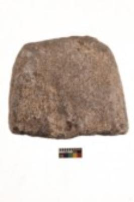 | Description / विवरण | Specimen of a roughly rectangular shaped saddle quern. It is brownish in colour and coarse in texture. It has flat base. |