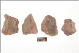 | Description / विवरण | Specimen of a Irregular flaked pebble with projected pointed top and flat bottom. |