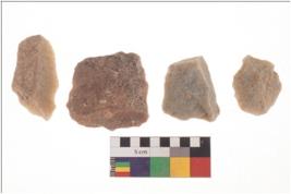 | Description / विवरण | Specimen of a sub rectangular flakes tool having flat flaked butt end and narrow pointed functional edge. It has thick mid rib portion. |