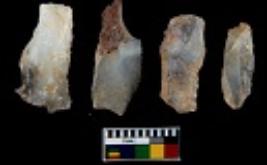 | Description / विवरण | There are n 4 utilized flake cores. There are multi directional irregular scar pattern on them. Three are tapering at one end and one has sharp edge. |