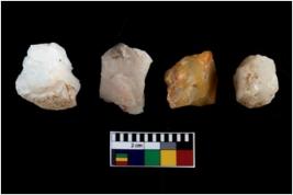 | Description / विवरण | Four utilised worked cores with sharp edges. Some of them are tapering at one end. Removal of flakes from few sides. |