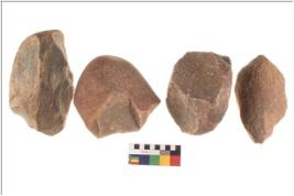 | Description / विवरण | Specimen of a Irregular flaked pebble with projected pointed top and flat bottom. |