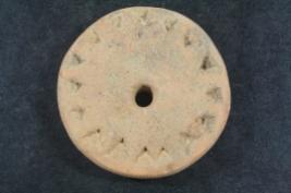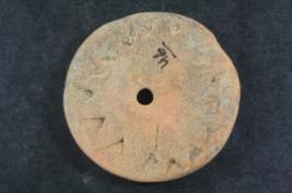 | Description / विवरण | It s a wheel made by terracotta. Colour is ochred and not well fired. Border is damaged & well decorated, a hole on it. Rubbing on the surface. |