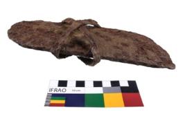 | Description / विवरण | A complete specimen of an axe with iron-ring fastener, bevelled edge, somewhat straight sides, less pronounced convex cutting edge and convex butt. |