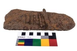 | Description / विवरण | A complete specimen of an axe. Heavily rusted with medium broad blade, less pronounced convex cutting edge, tapering sides and convex butt. |