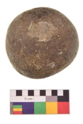 | Description / विवरण | Specimen of an uneven shaped hammerstone with smooth texture. It is blackish in colour and has flat base. |