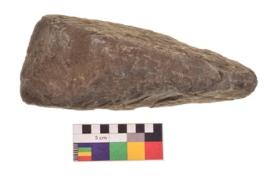 | Description / विवरण | Specimen of an handaxe with one elongated side for holding purpose. It is blackish in colour and smooth in texture. |