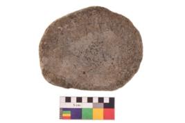 | Description / विवरण | Specimen of an uneven shaped hammerstone with smooth texture. It is blackish in colour and has flat base. |