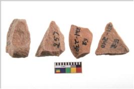 | Description / विवरण | There are n 4 utilized flake cores. There are multidirectional irregular scar pattern on both dorsal and ventral face of the flake cores. One has sharp edges and three have blunted edges. |
