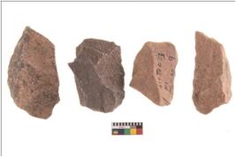 | Description / विवरण | There are n 4 utilized flake cores. There are multidirectional irregular scar pattern on both dorsal and ventral face of the flake cores. One has sharp edges and three have blunted edges. |