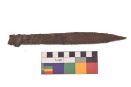 | Description / विवरण | Fragment of Iron sword .It is has retained core part, the blade edges damaged, It has long body with pointed top and circular cross section shaped. It is highly corroded in present condition. |