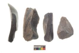 | Description / विवरण | There are n 4 utilized flake cores. There are multi directional irregular scar pattern on both dorsal and ventral face of the flake cores. Three are tapering at one end and one has sharp edge. |
