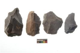 | Description / विवरण | There are n 4 utilized flake cores. There are multi directional irregular scar pattern on both dorsal and ventral face of the flake cores. Three have blunted edges and one has round edge. |