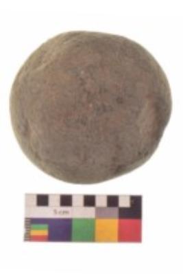 | Description / विवरण | Specimen of a roughly round shaped hammerstone with smooth texture. It is brownish in colour and round in cross section. |