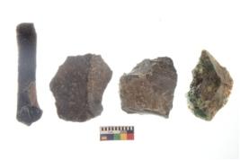 | Description / विवरण | There are n 4 utilized flake cores. There are multi directional irregular scar pattern on both dorsal and ventral face of the flake cores. One is tapering at one end and three have blunted edges. |