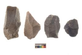 | Description / विवरण | There are n 4 utilized flake cores. There are multi directional irregular scar pattern on both dorsal and ventral face of the flake cores. Two are tapering at one end and two have blunted edges. |