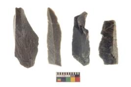 | Description / विवरण | There are n 4 utilized flake cores. There are multi directional irregular scar pattern on both dorsal and ventral face of the flake cores. One is tapering at one end and three have sharp edges. |