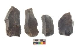 | Description / विवरण | There are n 4 utilized flake cores. There are multi directional irregular scar pattern on both dorsal and ventral face of the flake cores. Two are tapering at one end and two have sharp edges. |