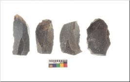 | Description / विवरण | There are n 4 utilized flake cores. There are multi directional irregular scar pattern on both dorsal and ventral face of the flake cores. Three are tapering at one end and one has sharp edge. |