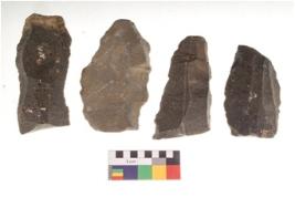 | Description / विवरण | There are n 4 utilized flake cores. There are multi directional irregular scar pattern on both dorsal and ventral face of the flake cores. Three are tapering at one end and one has sharp edge. |