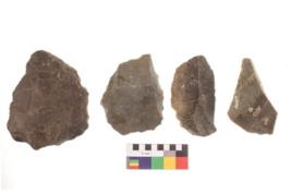 | Description / विवरण | There are n 4 utilized flake cores. There are multi directional irregular scar pattern on both dorsal and ventral face of the flake cores. Three are tapering at one end and one has sharp edge. |