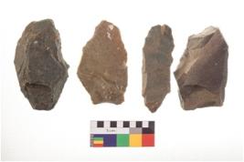| Description / विवरण | There are n 4 utilized flake cores. There are multi directional irregular scar pattern on both dorsal and ventral face of the flake cores. Three are tapering at one end and one has sharp edge. |