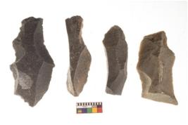| Description / विवरण | There are n 4 utilized flake cores. There are multi directional irregular scar pattern on both dorsal and ventral face of the flake cores. Three are tapering at one end and one has sharp edge. |