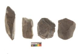 | Description / विवरण | There are n 4 utilized flake cores. There are multi directional irregular scar pattern on both dorsal and ventral face of the flake cores. Three are tapering at one end and one has sharp edge. |