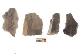 | Description / विवरण | There are n 4 utilized flake cores. There are multi directional irregular scar pattern on both dorsal and ventral face of the flake cores. Three have flat base and one has blunted edge. |