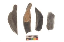 | Description / विवरण | There are n 4 utilized flake cores. There are multi directional irregular scar pattern on both dorsal and ventral face of the flake cores. Two are tapering at one end and two have sharp edges. |