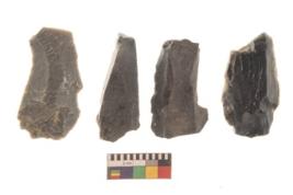 | Description / विवरण | There are n 4 utilized flake cores. There are multi directional irregular scar pattern on both dorsal and ventral face of the flake cores. Three are tapering at one end and one has sharp edge. |