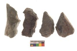 | Description / विवरण | There are n 4 utilized flake cores. There are multi directional irregular scar pattern on both dorsal and ventral face of the flake cores. Two are tapering at one end and two have sharp edges. |