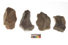 | Description / विवरण | There are n 4 utilized flake cores. There are multi directional irregular scar pattern on both dorsal and ventral face of the flake cores. Three have blunted edges and one has round edge. |