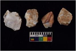 | Description / विवरण | There are n-4 of utilized Flakes . There are multidirectional irregular dominant scar pattern on both dorsal and ventral face of the cores. Some of them bulge of percussion and some are flat flake cores. |