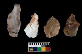 | Description / विवरण | There are n 4 utilized flake cores. There are multi directional irregular scar pattern on them. Two are tapering at one end and two have sharp edges. |