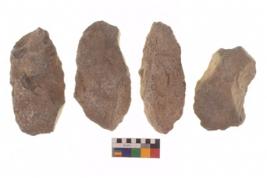 | Description / विवरण | There are n 4 of utilized worked cores and show irregular scar pattern . Three are tapering at one end. |