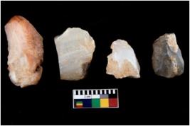 | Description / विवरण | There are n 4 utilized flake cores. There are multi directional irregular scar pattern on them. One is tapering at one end and three have blunted edges. |