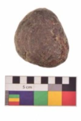| Description / विवरण | Specimen of an uneven shaped hammerstone. It is brownish in colour and coarse in texture. It has flat base. |