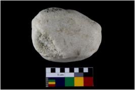 | Description / विवरण | Specimen of a spherical shaped hammer stone with battered surface. |