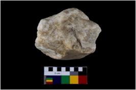 | Description / विवरण | Specimen of a spherical shaped hammer stone with battered surface. |