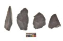 | Description / विवरण | There are n 4 utilized flake cores. There are multi directional irregular scar pattern on both dorsal and ventral face of the flake cores. Two are tapering at one end and two have sharp edges. |