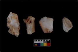 | Description / विवरण | Specimen of flake tools with prominent flaking marks. They are made up of a short flakes with sides trimmed. |