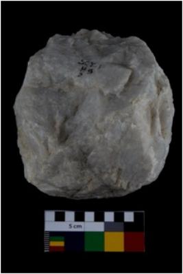 | Description / विवरण | Specimen of a spherical shaped hammer stone with battered surface. |