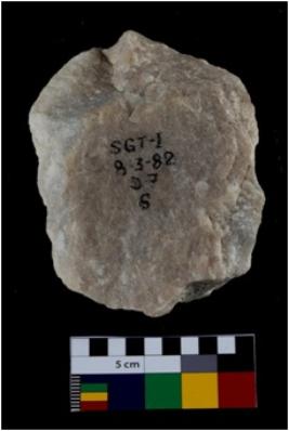 | Description / विवरण | Specimen of a spherical shaped hammer stone with battered surface. |