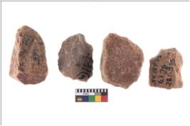 | Description / विवरण | There are n 4 utilized flake cores. There are multidirectional irregular scar pattern on both dorsal and ventral face of the flake cores. |